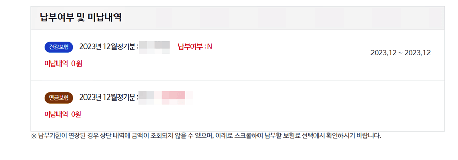 5. 건강보험과 연금보험의 납부여부 및 미납내역을 확인할 수 있습니다.
