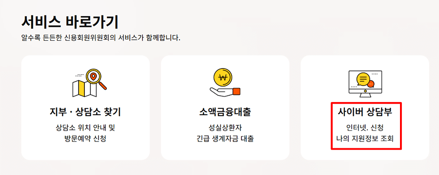 2. 스크롤을 내려 서비스 바로가기에서 [사이버 상담부] 메뉴를 클릭합니다.