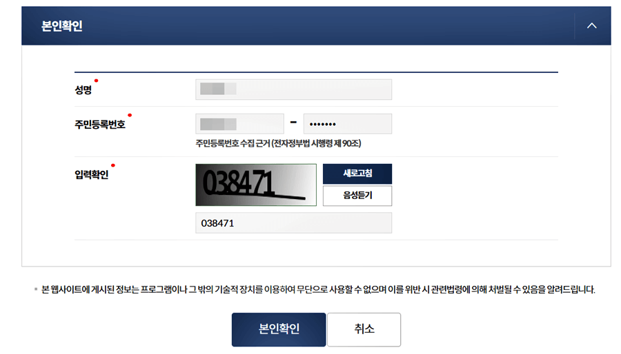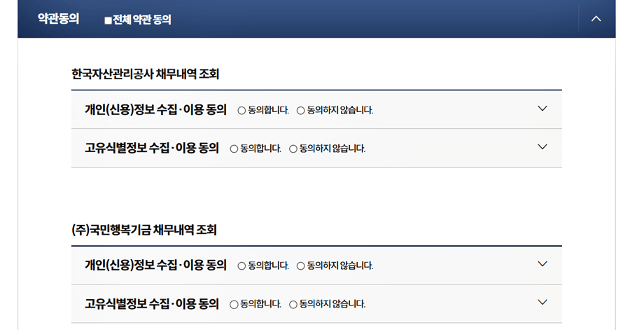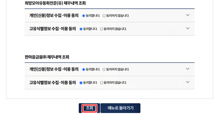 5. 각종 약관에 동의 후, 조회하기 버튼을 클릭합니다.