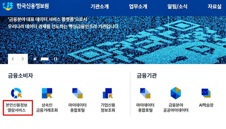 1. 한국신용정보원(크레디트포유) 홈페이지에 접속하여 본인신용정보 열람서비스로 이동합니다.