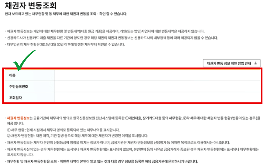 한국신용정보원에서는 채권자 변동정보, 개인회생 신청 및 정보, 대출채권소각정보, 신용정보 등록 현황등을 확인할 수 있으며 본인 신용정보조회서를 발급받을 수 있습니다.