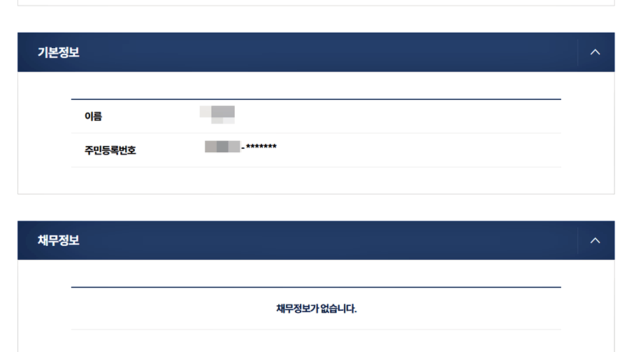 4. 개인채무 페이지에서 본인 정보를 확인합니다.
