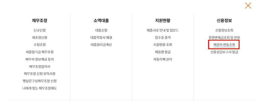 4. 신용정보에서 채권자 변동조회 서비스를 클릭합니다.