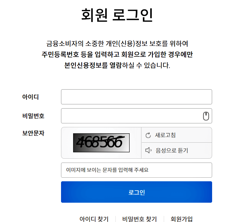 3. 원하는 사항을 클릭하고 회원가입을 통해 로그인합니다.(회원으로 가입한 경우에만 본인신용정보를 열람하실 수 있습니다.)