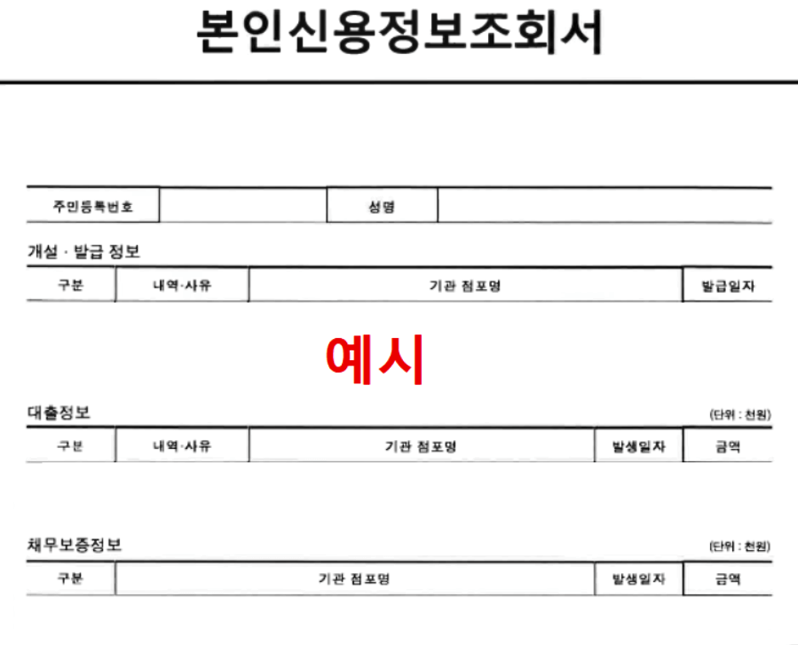 4. 조회서 발급을 신청하면 예시와 같은 조회서를 발급받을 수 있습니다. 단, 대부업권 대출정보의 상세내역은 해당 업체를 통하여 확인·발급받으실 수 있습니다.