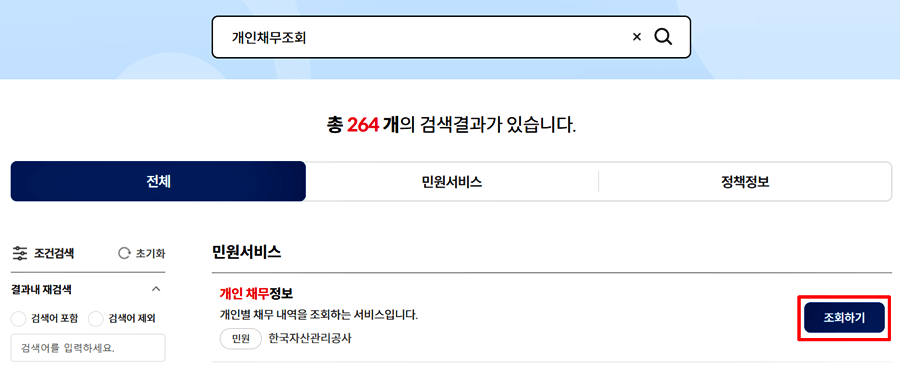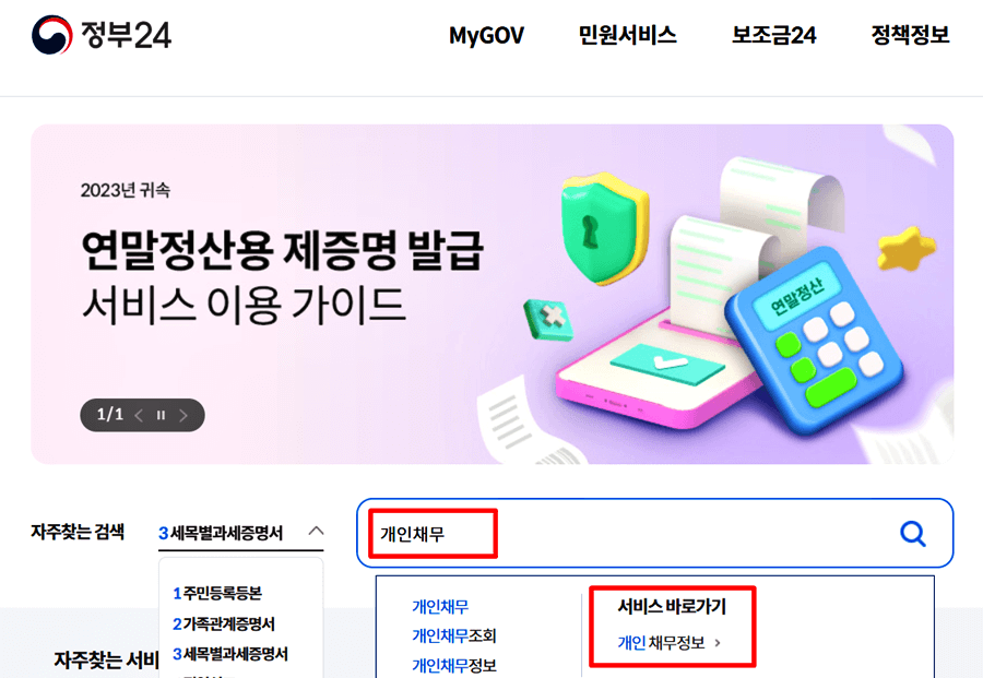 2. 검색란에 "개인채무조회" 입력 후 조회 페이지로 이동합니다.