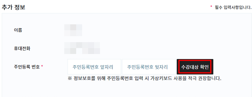 4. 추가 정보를 입력하고 수강대상 확인 버튼을 클릭합니다.