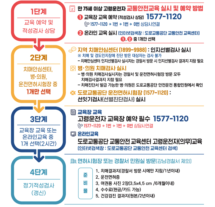 만 75세 이상 고령운전자는 치매검사 실시 후 교통안전교육을 이수하여야 정기적성검사(갱신)를 받을 수 있습니다. 아래 단계별 예약 안내를 참고하시기 바랍니다.