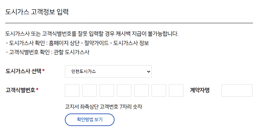 고객식별번호 또는 도시가스사를 잘못 입력할 경우 사용량 조희가 불가능하기 때문에 지급 대상에서 제외될 수 있습니다.