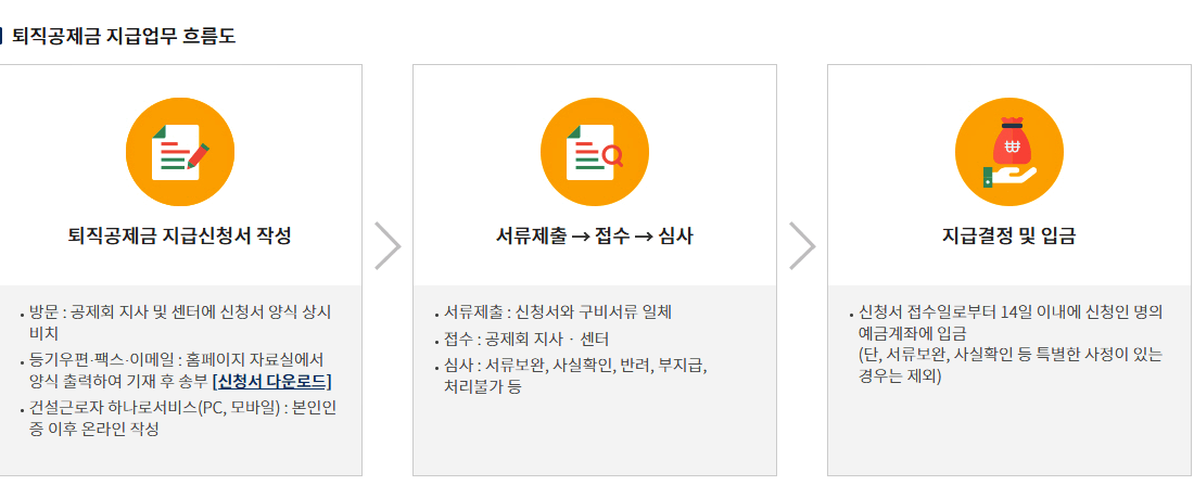 -구비서류:퇴직공제금 지급신청서(지급청구서 양식 다운로드 ), 신분증 사본, 퇴직사유별 구비서류 일체