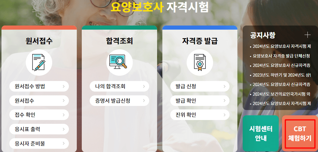 기출문제란 시험 문제 중 이미 출제되었던 문제들을 의미하며, 자격증 시험의 합격률을 높이는 효과적인 방법은 이러한 기출문제를 반복해서 풀어보는 것입니다. 이번 포스팅에선 2024년 요양보호사 기출문제 다운로드와 요양보호사 자격시험(CBT)에 관한 안내 및 유의사항 숙지, 조작법 등을 체험하여 응시자가 CBT(PC로 보는 시험)에 적응할 수 있도록 돕는 서비스를 알아보도록 하겠습니다.