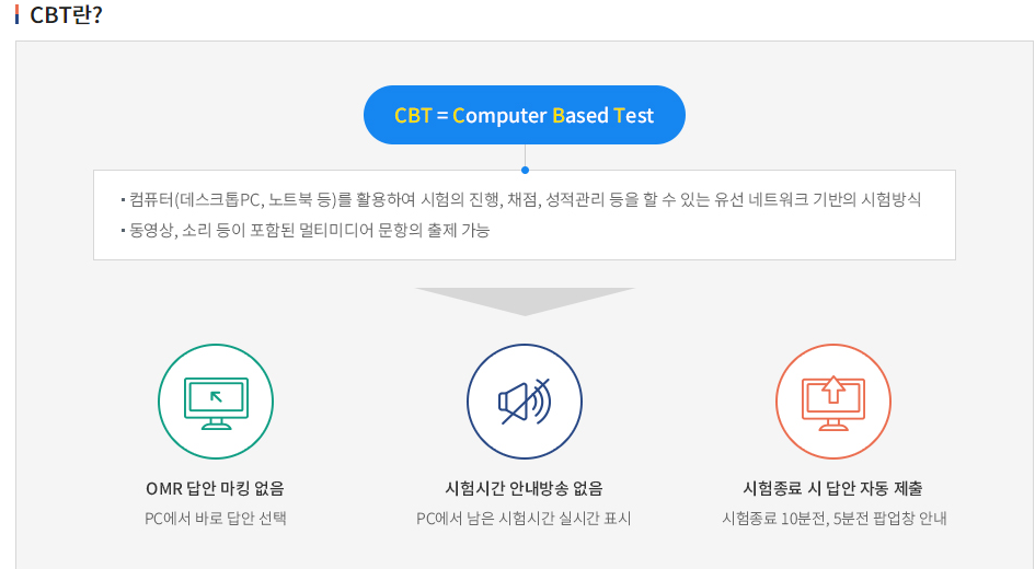 CBT란 컴퓨터(데스크톱PC,노트북 등)를 활용하여 시험의 진행, 채점, 성적관리 등을 할 수 있는 유선 네트워크 기반의 시험 방식을 의미합니다. 요양보호사 자격증 시험은 종이 시험지가 아닌 컴퓨터로 진행되는 시험입니다. 이처럼, 요양보호사 자격증 시험은 종이 시험지가 아닌 컴퓨터로 진행되는 시험입니다.