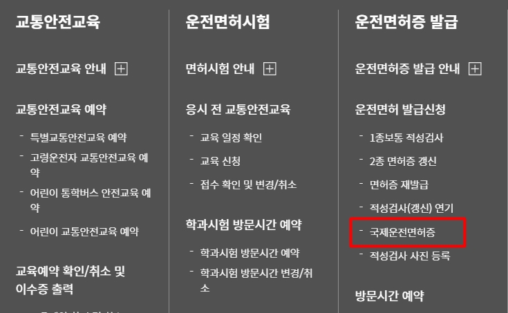 1. 도로교통공단 홈페이지 로그인 후 전체메뉴에서 국제운전면허증으로 이동합니다.
