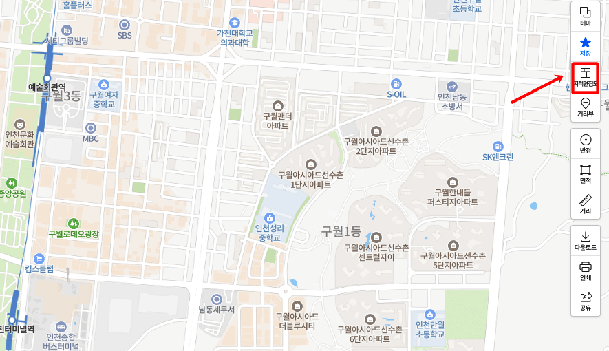 ① 카카오맵에서 원하는 위치를 검색 후 우측상단 레이어-지적편집도를 클릭합니다.