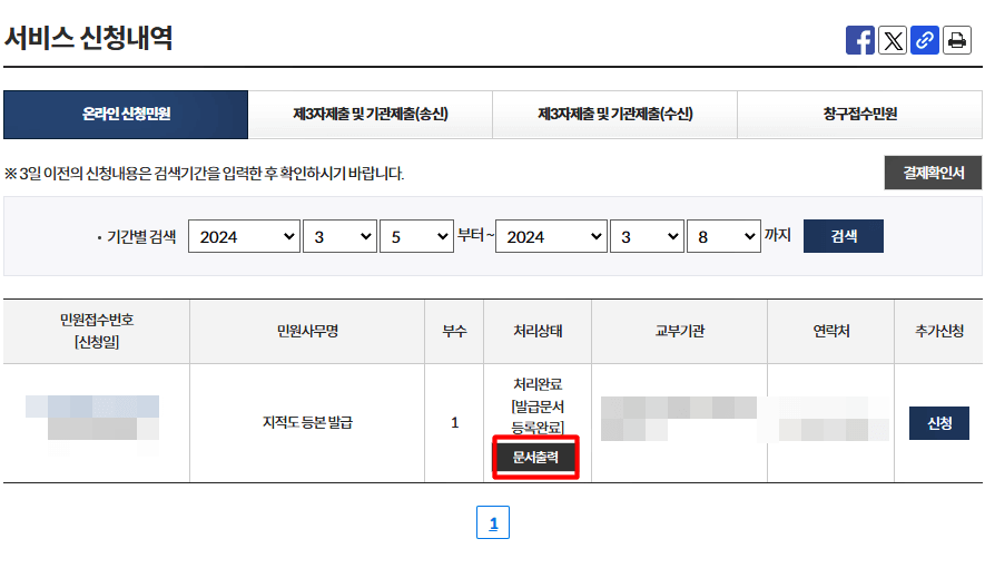 ④신청내용 입력 및 수령방법(온라인) 선택 후 민원신청하기 버튼을 클릭합니다.