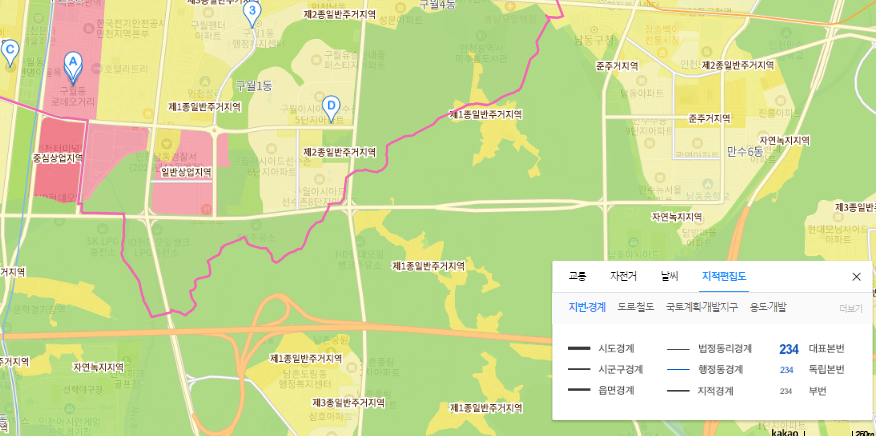 ② 네이버 지도와 마찬가지로 지번·경계, 개발, 용도, 도로·철도, 국토계획 등을 확인할 수 있습니다.
