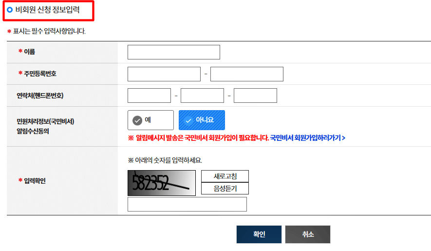 ③ 약관에 동의 후 신청정보를 입력합니다.(비회원 신청 시)