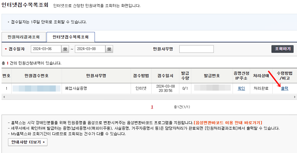 4. 즉시 민원처리가 완료되며 발급받은 문서는 출력 가능합니다.