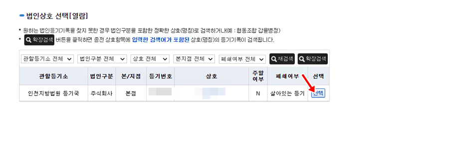 4. 법인이 검색되면 선택 버튼을 클릭합니다.