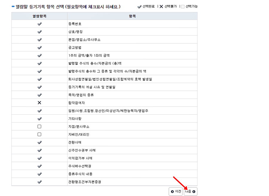 6. 열람할 등기기록 항목을 선택 후 다음으로 넘어갑니다.