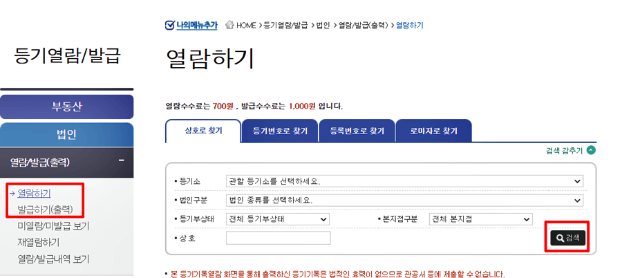 3. 등기소, 법인구분, 상호 등 정보 입력 후 검색버튼을 클릭합니다.
