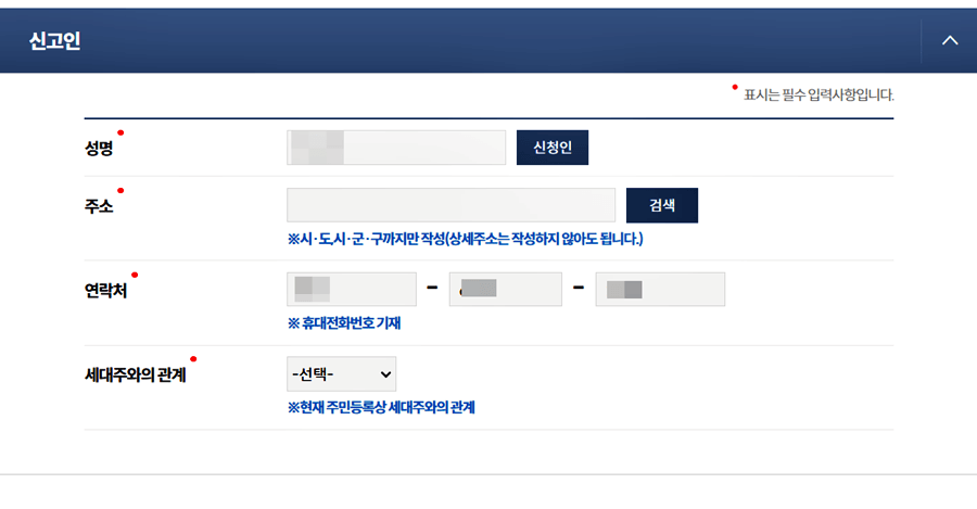4. 신고인란에서 주소 정보를 입력하고, 세대주와의 관계를 선택합니다.