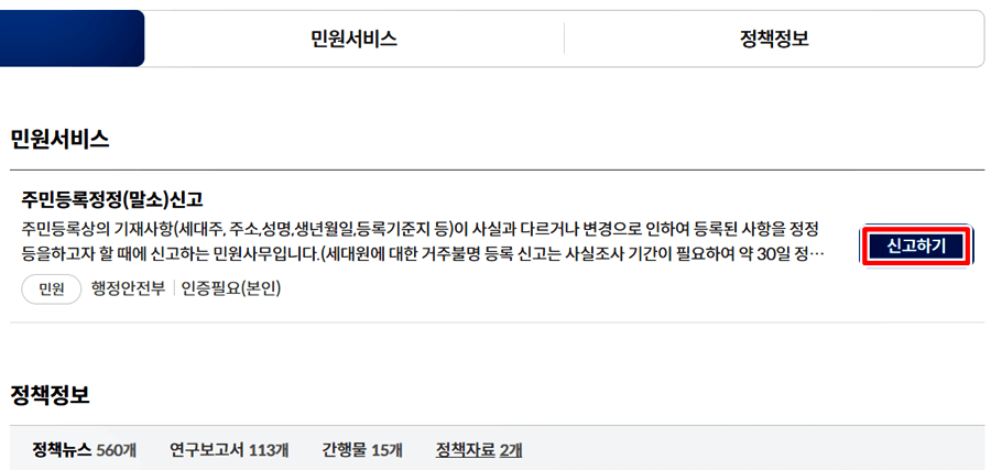 2.세대주 분리 또는 변경으로 검색하여 주민등록정정(말소) 신고를 클립 합니다.