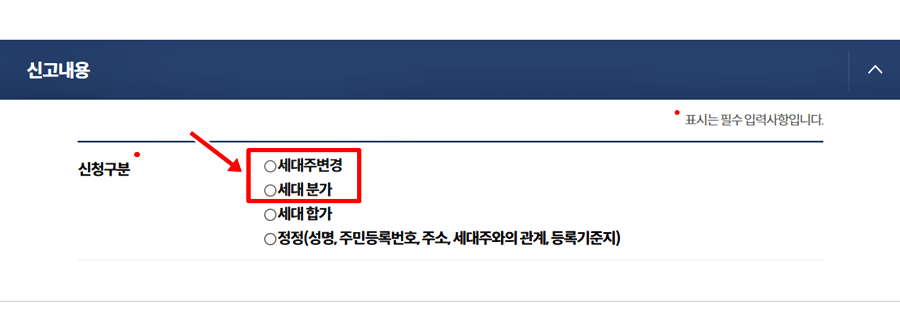 5. 신고내용에서 세대주 분가 또는 변경을 선택합니다.