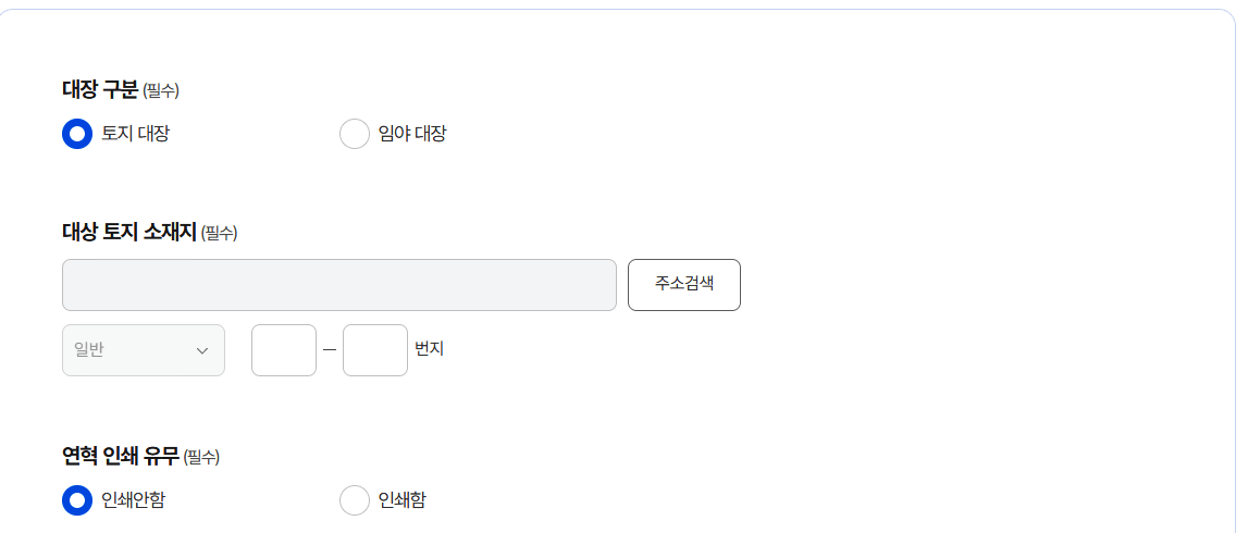 4. 확인하고자 하는 대상 토지의 소재지를 입력 후 민원신청을 진행합니다.