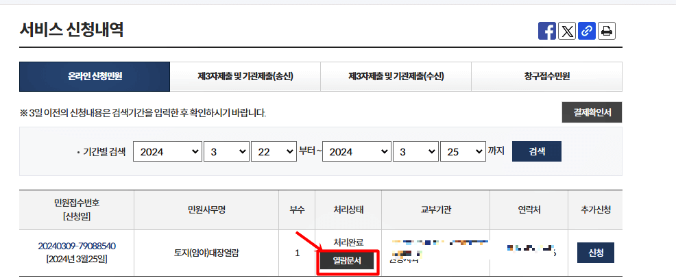 5. 신청 후 즉시 처리 완료되어 토지대장을 무료열람할 수 있습니다.