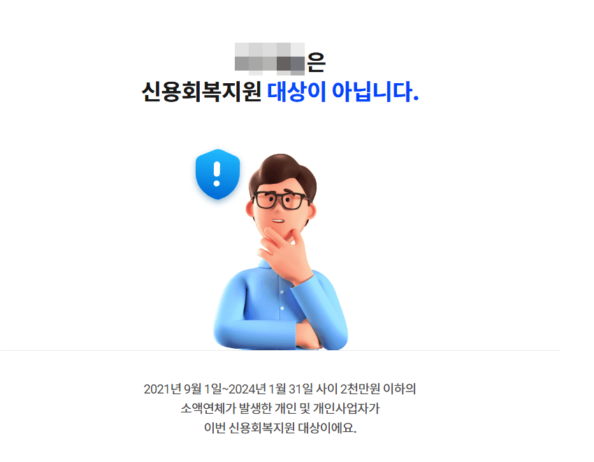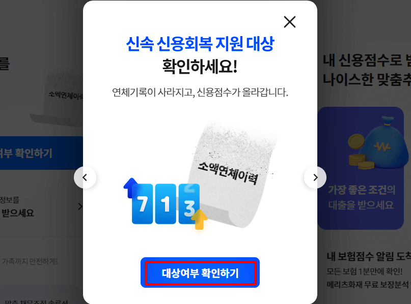 2. 팝업창이 뜨지 않을 시에는 메인 화면에서 신용사면 대상여부 확인하기 버튼을 클릭하여 진행합니다.