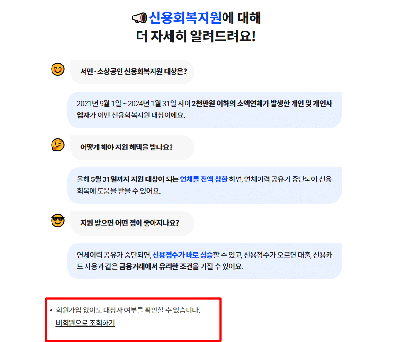 3. 회원가입 없이 비회원으로도 대상자 여부를 확인할 수 있습니다.(본인인증 필요)