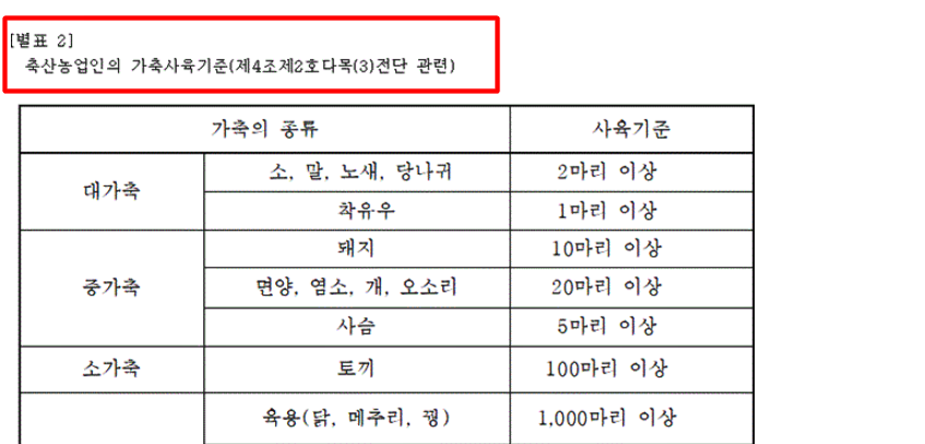 - 330㎡이상의 농지에 「농지법 시행규칙」 제33조에 규정된 축사 관련 부속 시설을 설치하여 「농업인 확인서 발급규정」 별표 2 기준 이상의 가축규모를 사육하는 농업인