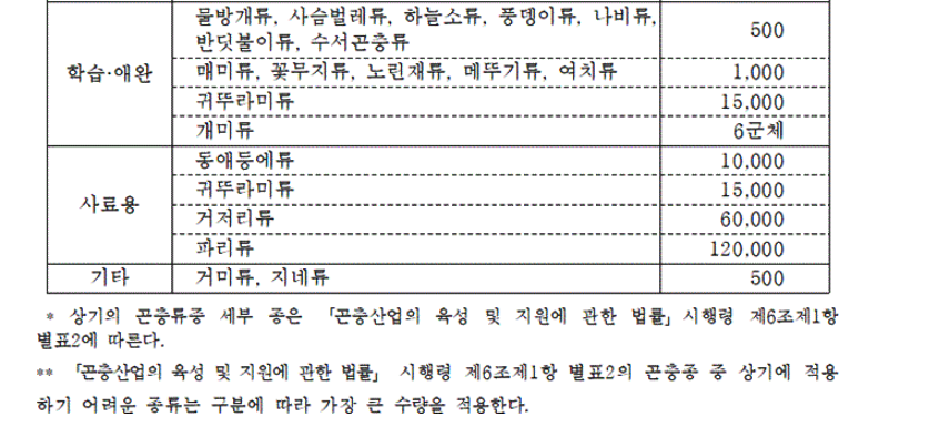 - 「곤충산업의 육성 및 지원에 관한 법률」제12조에 따라서 곤충의 생산 또는 사육에 대해 신고확인증을 받은 자로, 별표 4의 사육규모 이상으로 대상곤충을 사육하는 농업인