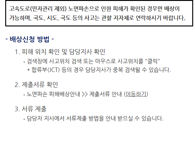 포트홀 사고의 경우는 운전자의 잘못이 아닌 시설물 관리 문제이기 때문에 보상 신청이 가능합니다. 고속도로에서 발생 시에는 한국도로공사, 국도나 시 또는 도에서 관리하는 일반도로는 관할 지자체에 신청할 수 있습니다. 관할지자체는 한국도공사홈페이지에서 확인 가능합니다.