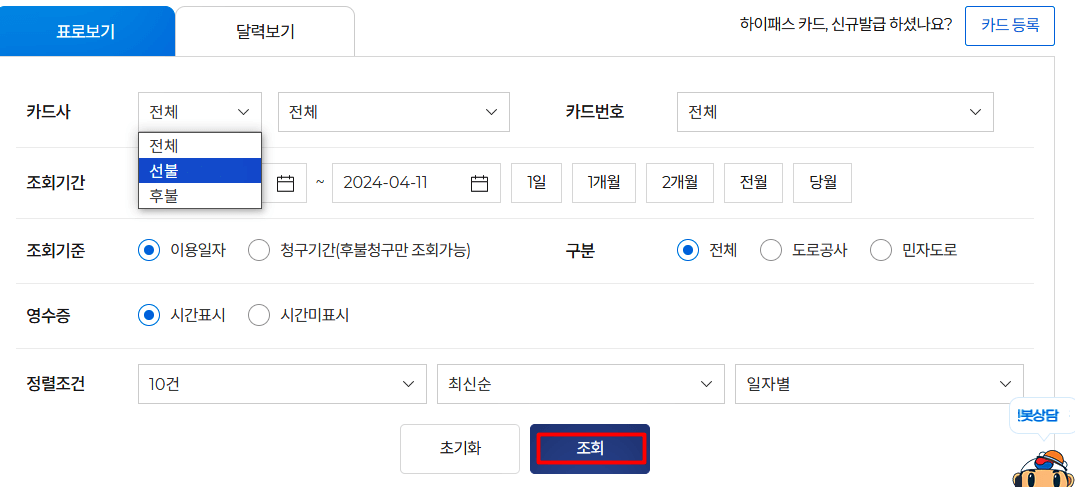 3. 카드사, 카드번호 조회기간을 지정하여 조회하기 버튼을 클릭합니다.