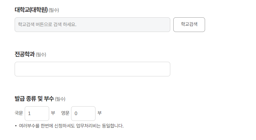 5. 대학교(대학원) 검색 후 전공학과, 발급 종류 및 부수를 선택합니다.