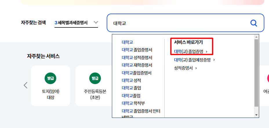 1. 정부 24 홈페이지에 접속하여 대학교 졸업증명서를 검색합니다.