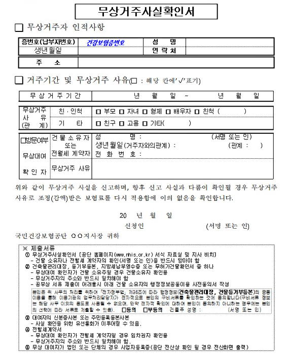 무상거주사실확인서는 건강보험료를 정정하거나 세금을 면제받고자 할 때, 세대분리가 필요할 때 또는 임대인이 주택담보대출등을 신청하기 위해 임차인에게 요청하는 경우도 있습니다. 무상 거주자는 이 서류를 통해 전월세에 대한 지역 보험료를 면제받을 수 있습니다. 세대분리의 경우, 세대주와의 관계는 부모·형제를 제외한 3촌 이상의 관계여야 분리가 가능합니다. 서류 작성은 소유주나 임차인이 작성하며 도장이나 서명이 필요합니다.