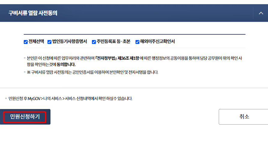 6. 구비서류 열람 사전동의 후 민원신청하기 버튼을 클릭합니다.