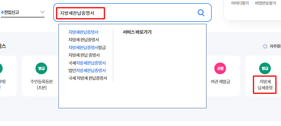 2. 지방세납세증명서를 입력하여 검색 또는 자주 찾는 서비스에서 이동합니다.