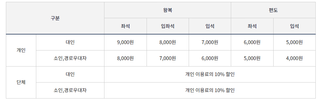 | 구분 | 대인 | 소인 및 경로우대 | 무료 |