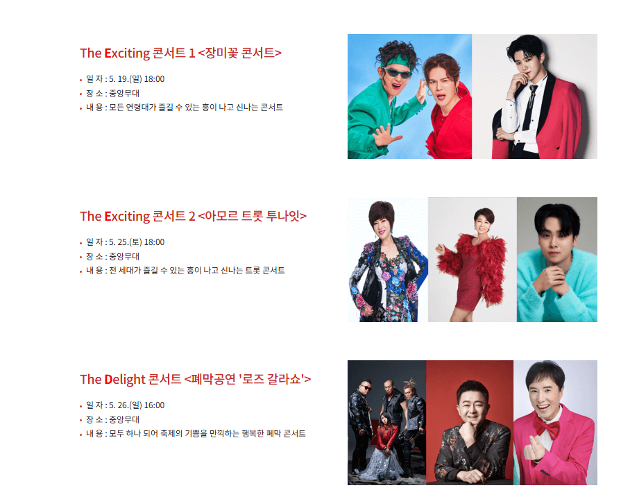 - 그 밖의 뮤지컬, 국악공연, 퍼레이드 공연들이 준비되어 있으며, 직접 배우고 즐기는 체험 프로그램이 운영됩니다.