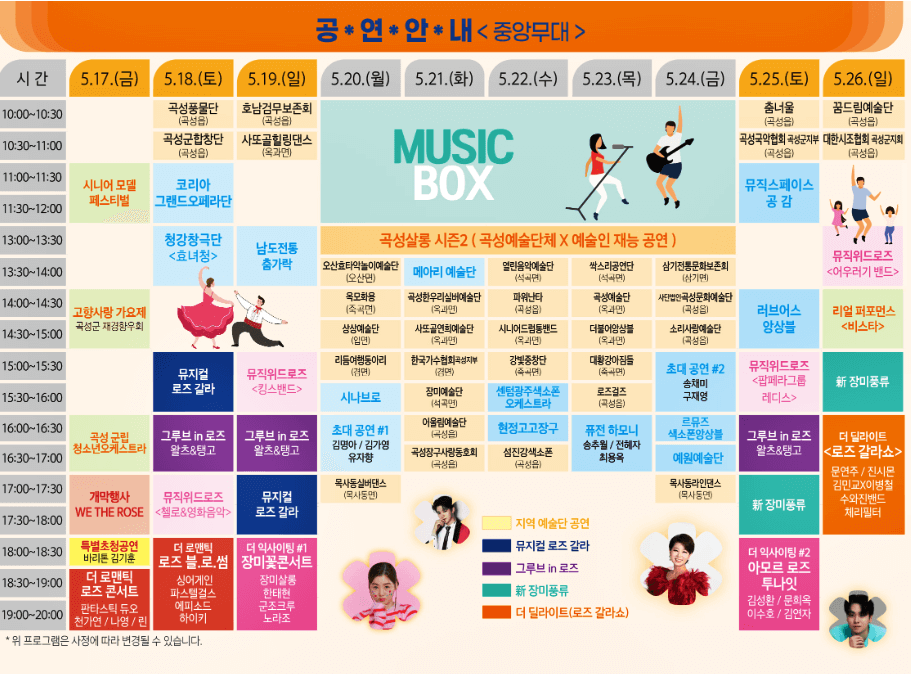 축제기간 동안 일별로 다양한 공연과 이벤트가 준비되어 있습니다.