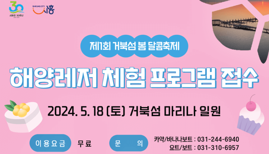 시흥 거북섬은 올해부터 사계절을 주제로 하는 계절별 테마형 축제를 진행합니다. 그중 거북섬 달콤 축제는 사계절을 주제로 하여 개최하는 축제의 서막으로, 봄과 어울리는 달콤 디저트를 주제로 진행됩니다. 공연과 이벤트, 달콤 디저트 부스 운영, 해양 레저 프로그램 운영 등 다양한 볼거리와 즐길거리가 펼쳐질 예정이니 아래 내용 참고하시어 즐거운 축제를 즐기시기 바랍니다.