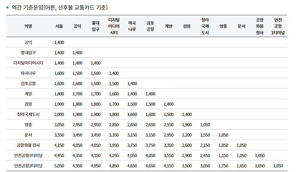 예) 서울역 승차 인천공항 1 터미널 하차 요금:4,450원 / 서울역 승차 인천공항 2 터미널 하차 요금:5,050원