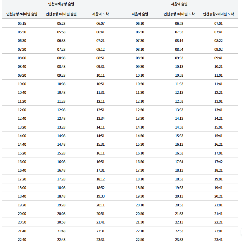 서울역-공덕-홍대입구-디지털미디어시티-마곡나루-김포공항-계양-검암-청라국제도시-영종-운서-공항화물청사-인천공항 1 터미널-인천공항 2 터미널 총 14개의 정거장으로 이루어져 있으며, 서울역에서 인천공항 2 터미널까지 51분이 소요(직통)됩니다.