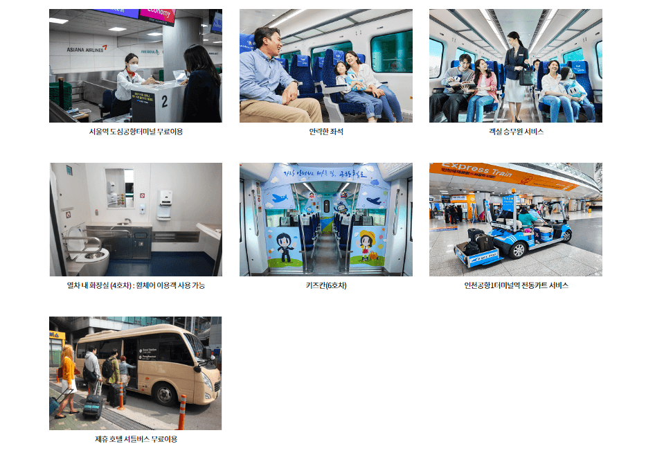 서비스 - 서울역 도심공항터미널 무료, 열차 지정 좌석, 승무원 서비스 제공, 전동카트 서비스, 무료 와이파이, 인천공항 T1 고객 라운지 이용, 무료 생수(요청 시)