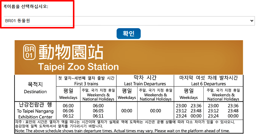 아래와 같이 해당 역을 선택하여 첫차/막차 시간을 확인할 수 있습니다.