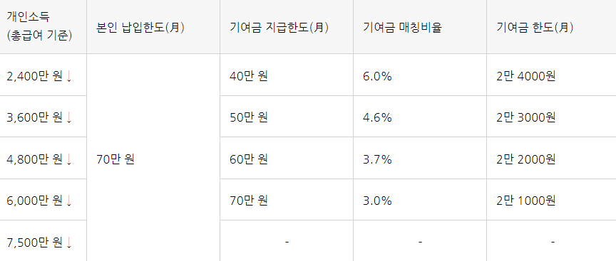 소득 :소득 조건으로는 개인 소득이 7,500만 원 이하이며, 가구소득중위 180% 이하입니다. 총 급여기준 6천만 원 이하는 정부 기여금 지급과 비과세혜택까지 받아 볼 수 있으며 6,000~7,500만 원이라면 정부기여금 없이 비과세만 적용합니다.